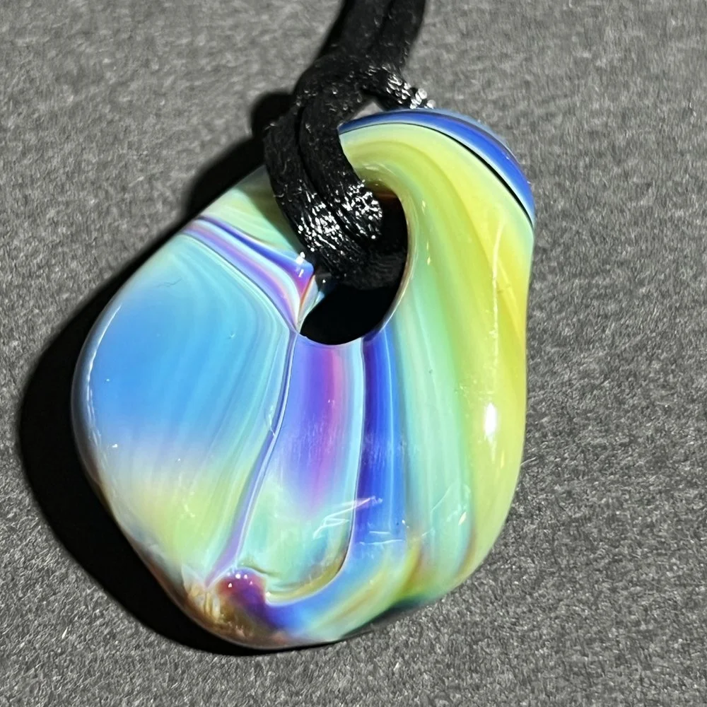 Unique solid glass pendant made from Josh's unique fused cane encased in clear glass. This particular cane might even appear in recent (and future) Simpson Planets of various sizes.