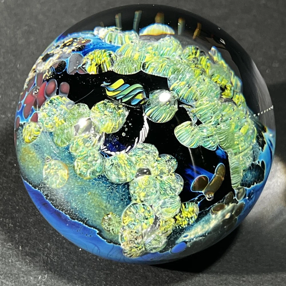 Solid glass imaginary world with a core of blue New Mexico glass and colorful elements evoking continents, mountains, beaches, and structures that suggest the presence of intelligent life, often including a spaceship, satellite or other flying objects.