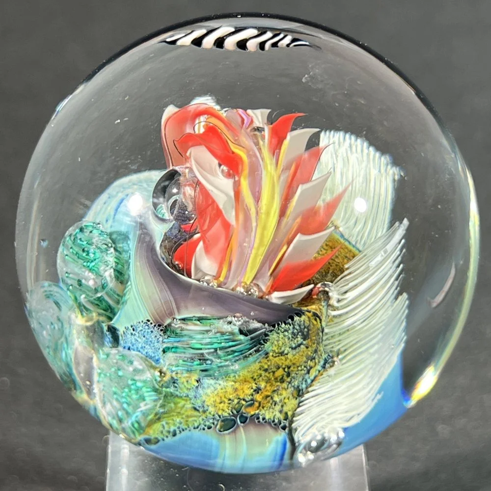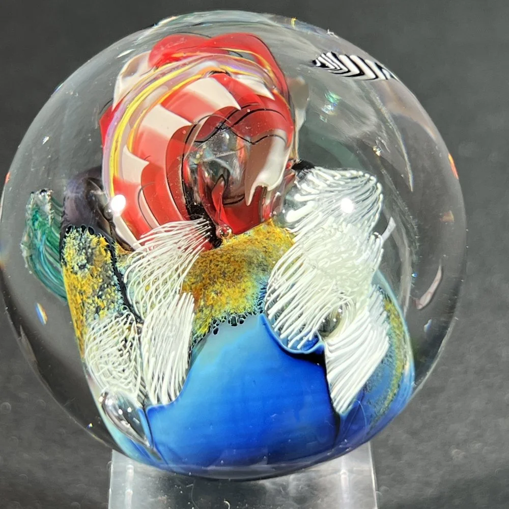 A completely spherical orb, approximately 2.25" diameter, signed JS and the year it was made.