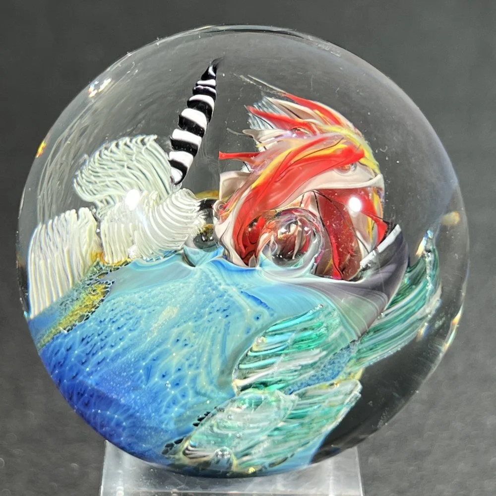 Solid glass imaginary world with a core of blue New Mexico glass, with continents, mountains, beaches, swirling oceans, one or more spaceships, and structures that suggest the presence of intelligent life.