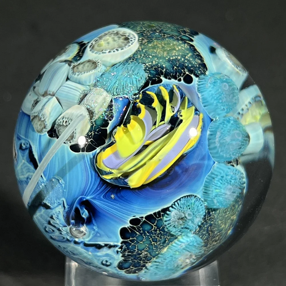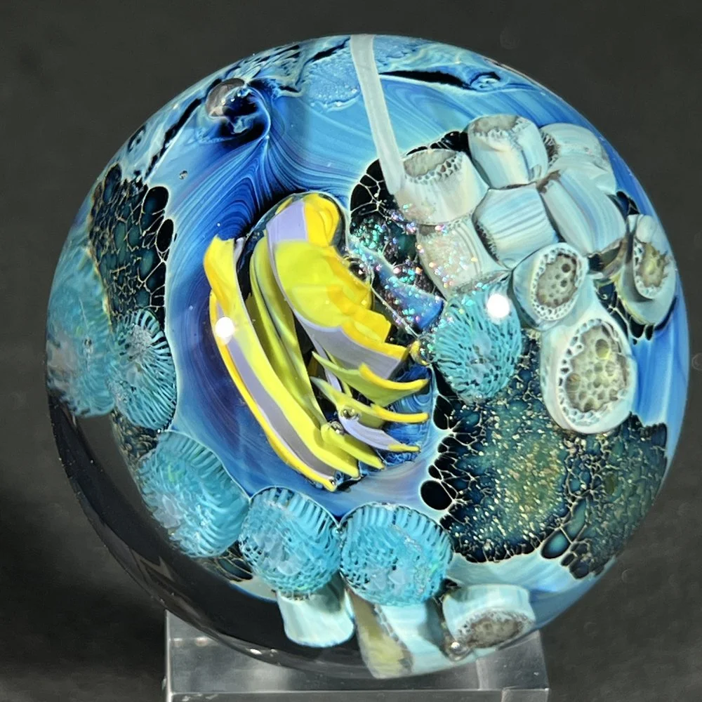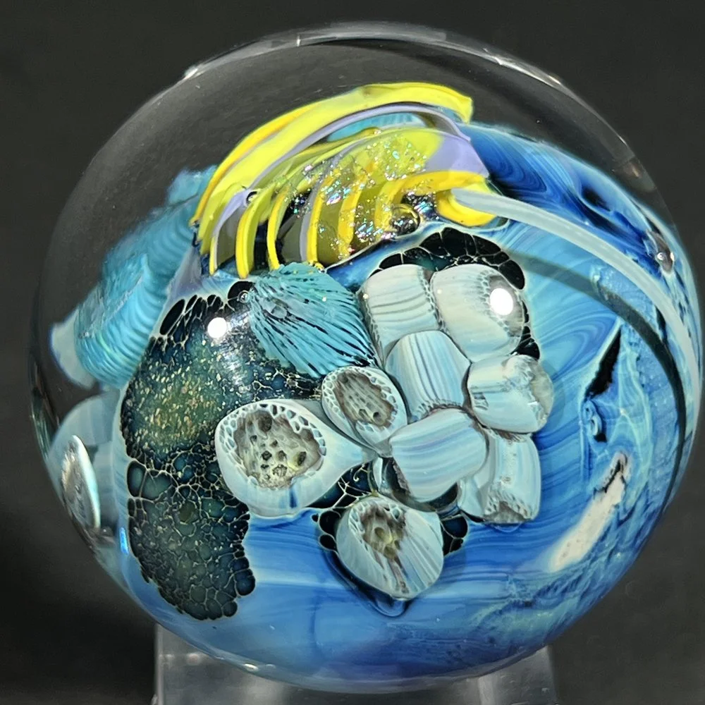 Solid glass imaginary world with a core of blue New Mexico glass, with continents, mountains, beaches, swirling oceans, one or more spaceships, and structures that suggest the presence of intelligent life.