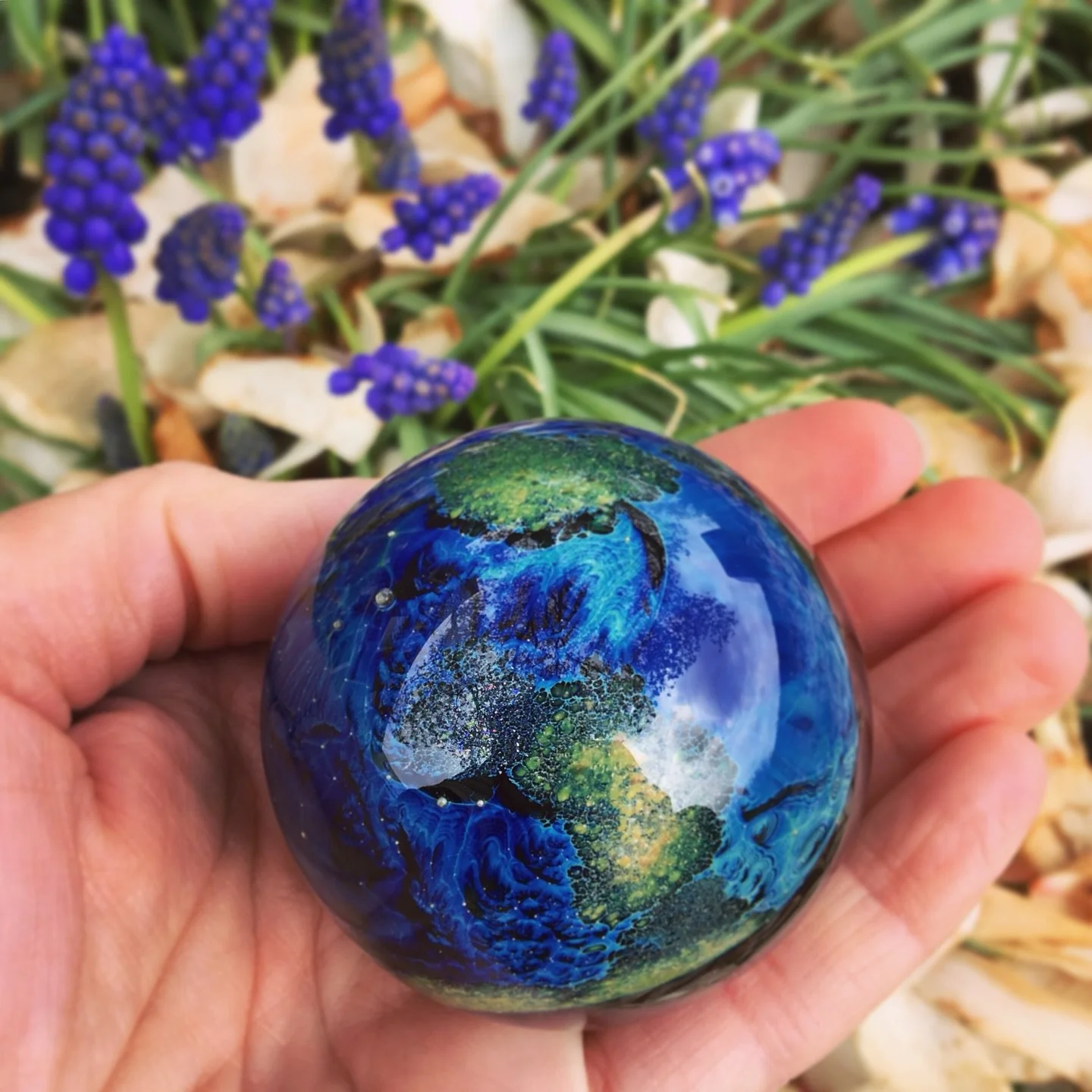 Solid glass imaginary world with a core of blue New Mexico glass and colorful elements resembling continents, mountains, beaches, and structures that suggest the presence of intelligent life, including a spaceship, satellite or other flying object.