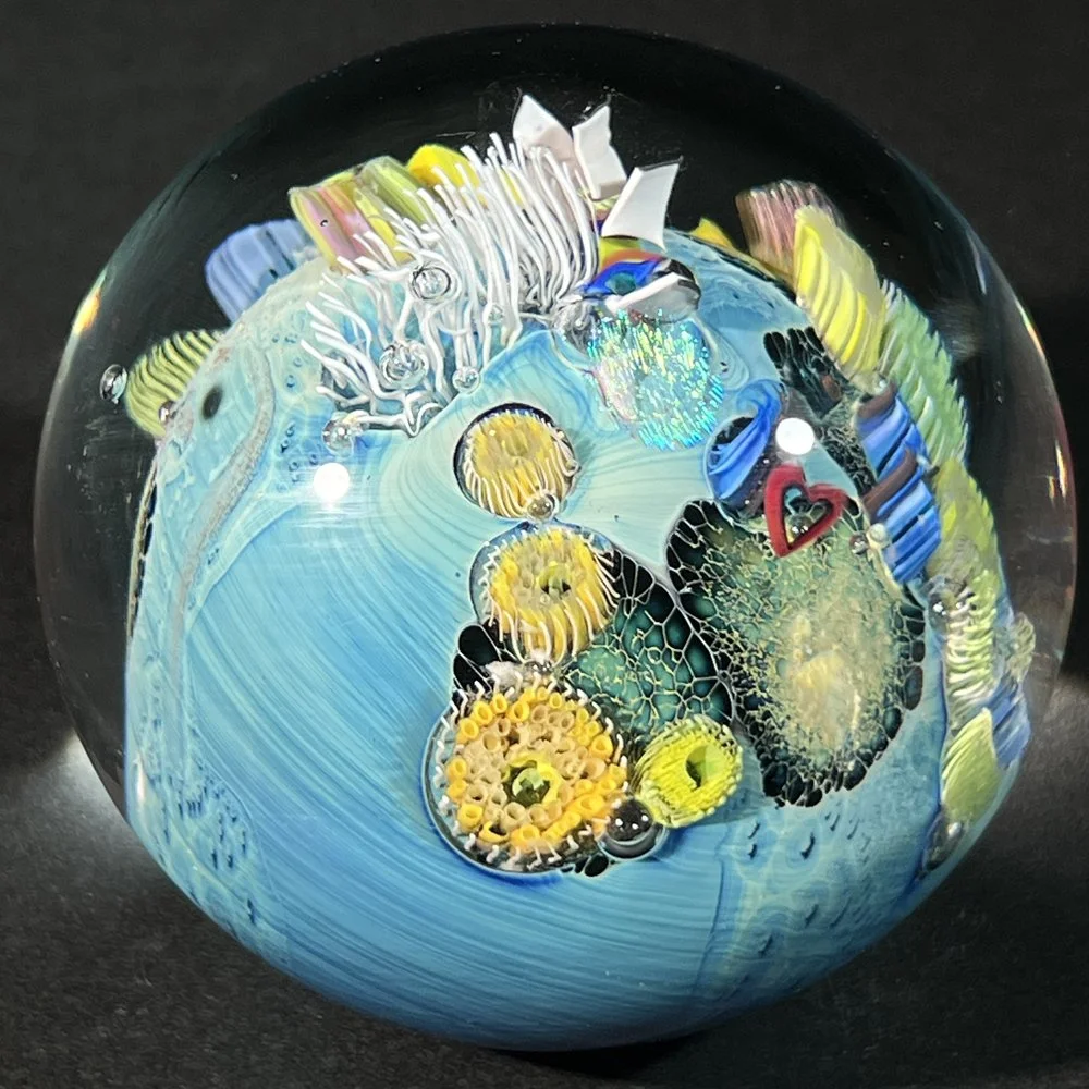 Solid glass spherical world with heart-shaped cane in orbit above or on the surface of the whimsical landscape… a perfect way to tell someone you love that they mean the world to you.