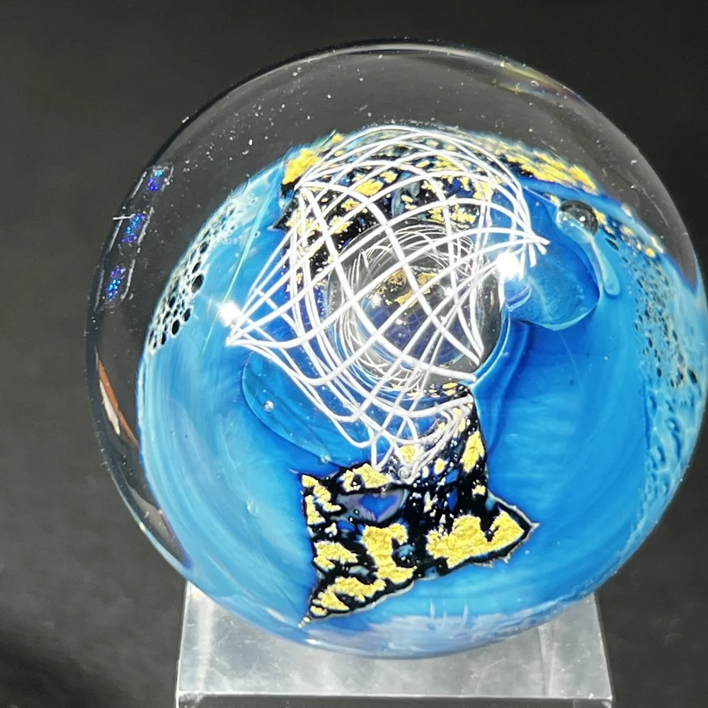 A completely spherical orb, approximately 1.75" diameter, signed JS and the year it was made.