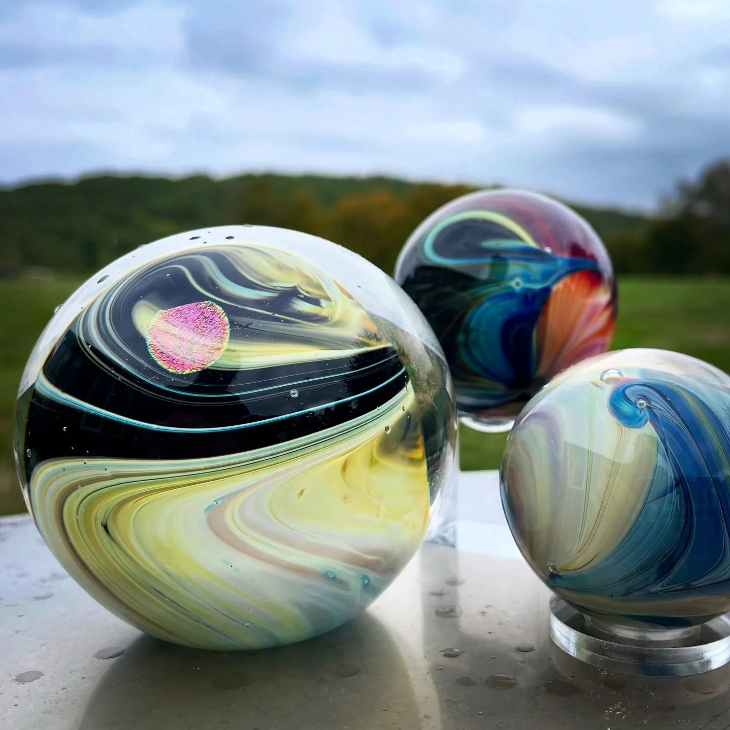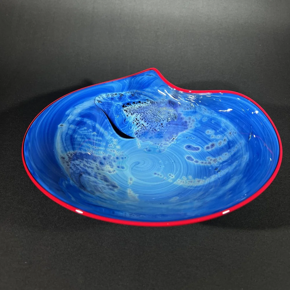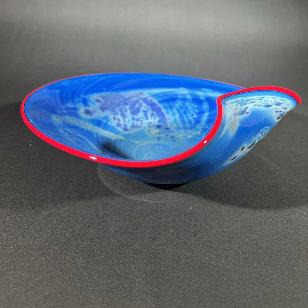Unique, sculpted vessel made of Josh's signature New Mexico glass accented by a red lip wrap. Rich blue patterning is reminiscent of the night sky or swirling seas, inside and out.