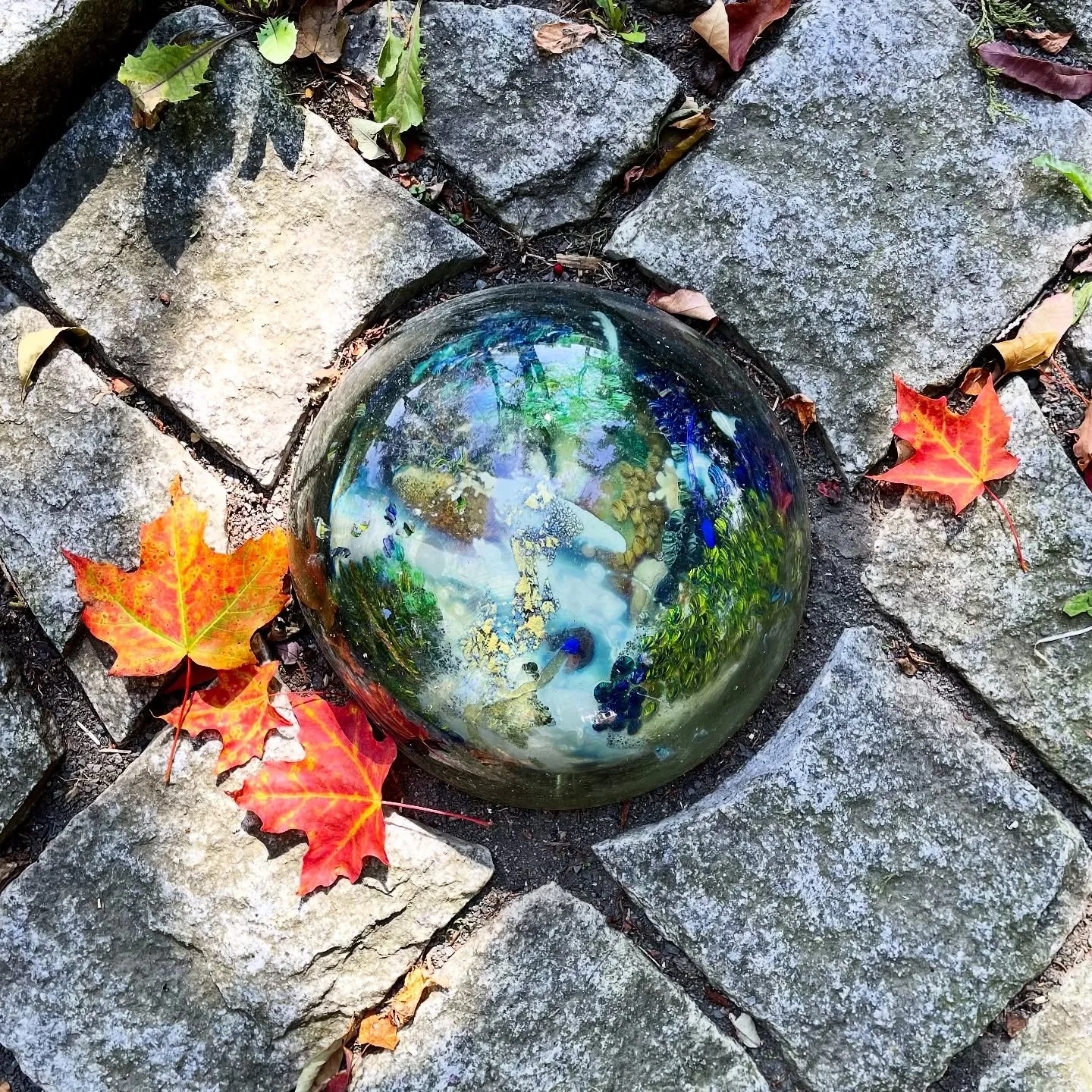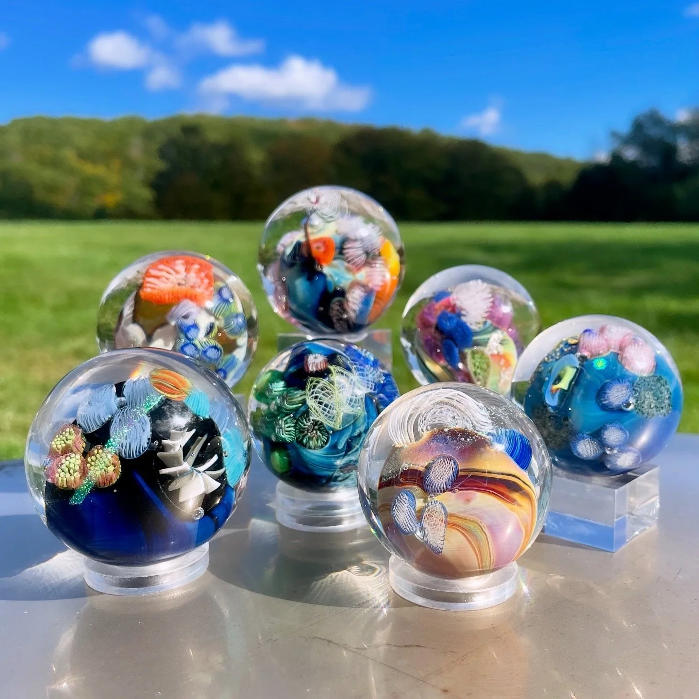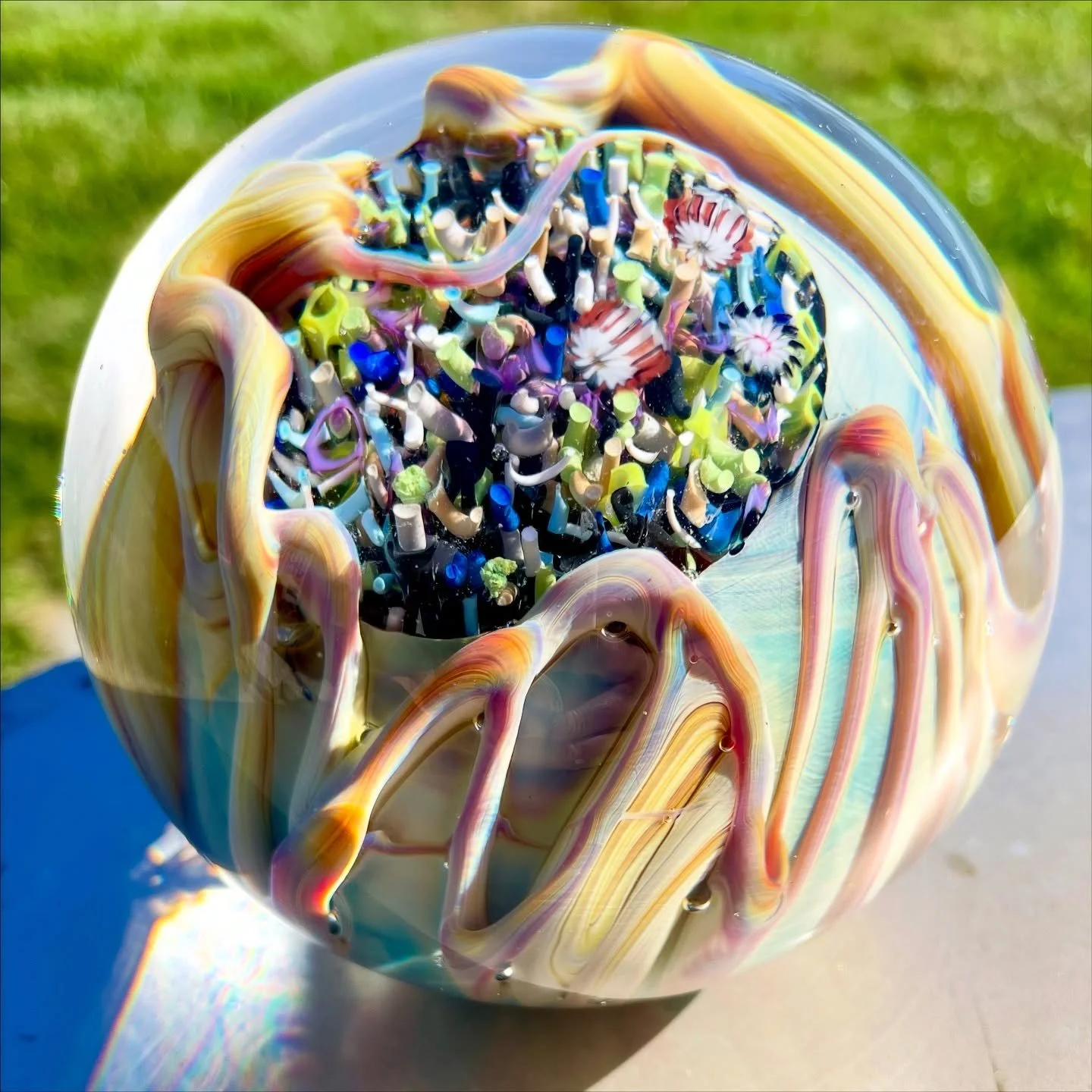 Unique, sculpted vessel made of Josh's signature New Mexico glass accented by a red lip wrap. Rich blue patterning is reminiscent of the night sky or swirling seas, inside and out.