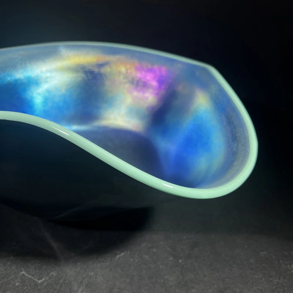 Unique, sculpted vessel made of Josh's signature New Mexico glass accented by a lilac lip wrap. Rich blue patterning is reminiscent of the night sky or swirling seas, inside and out.