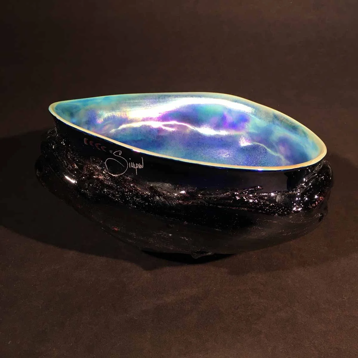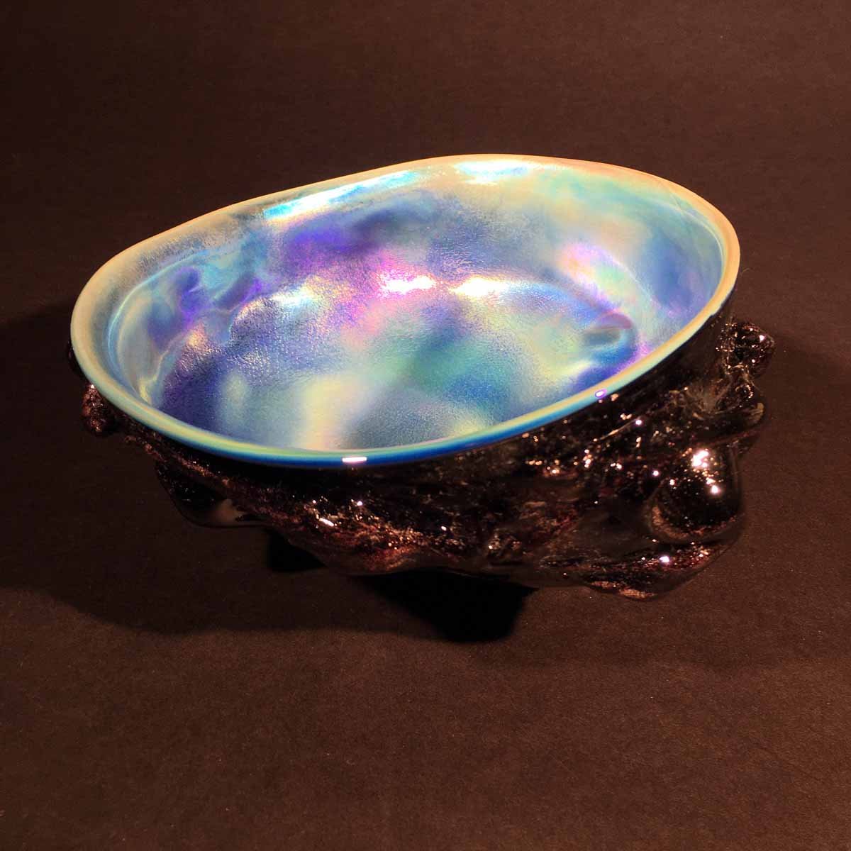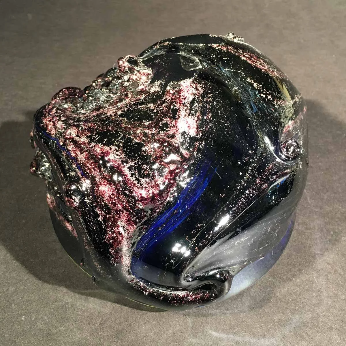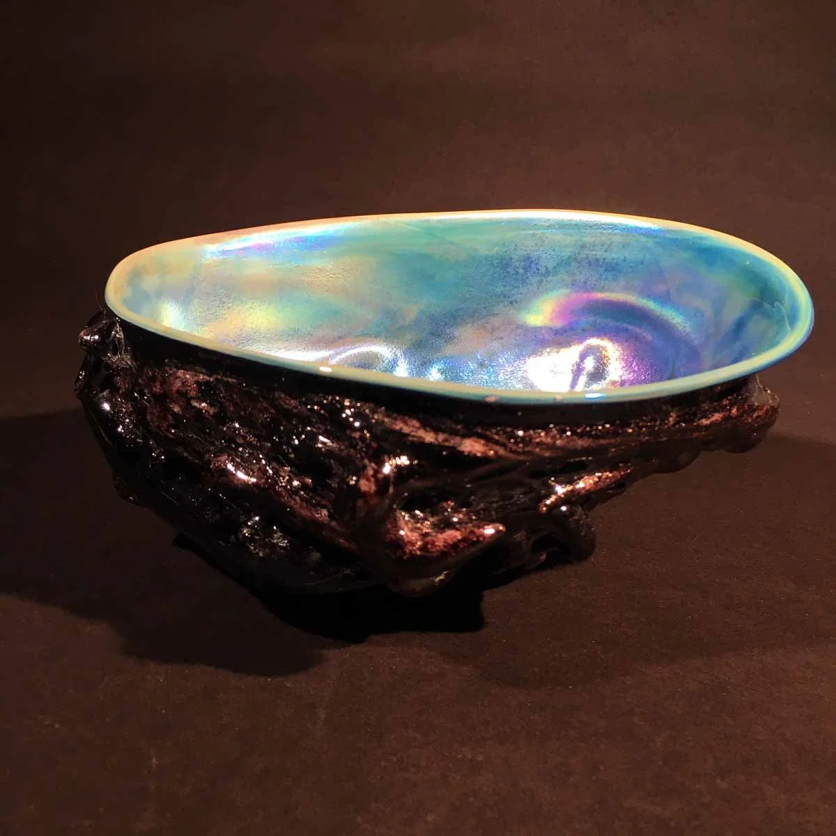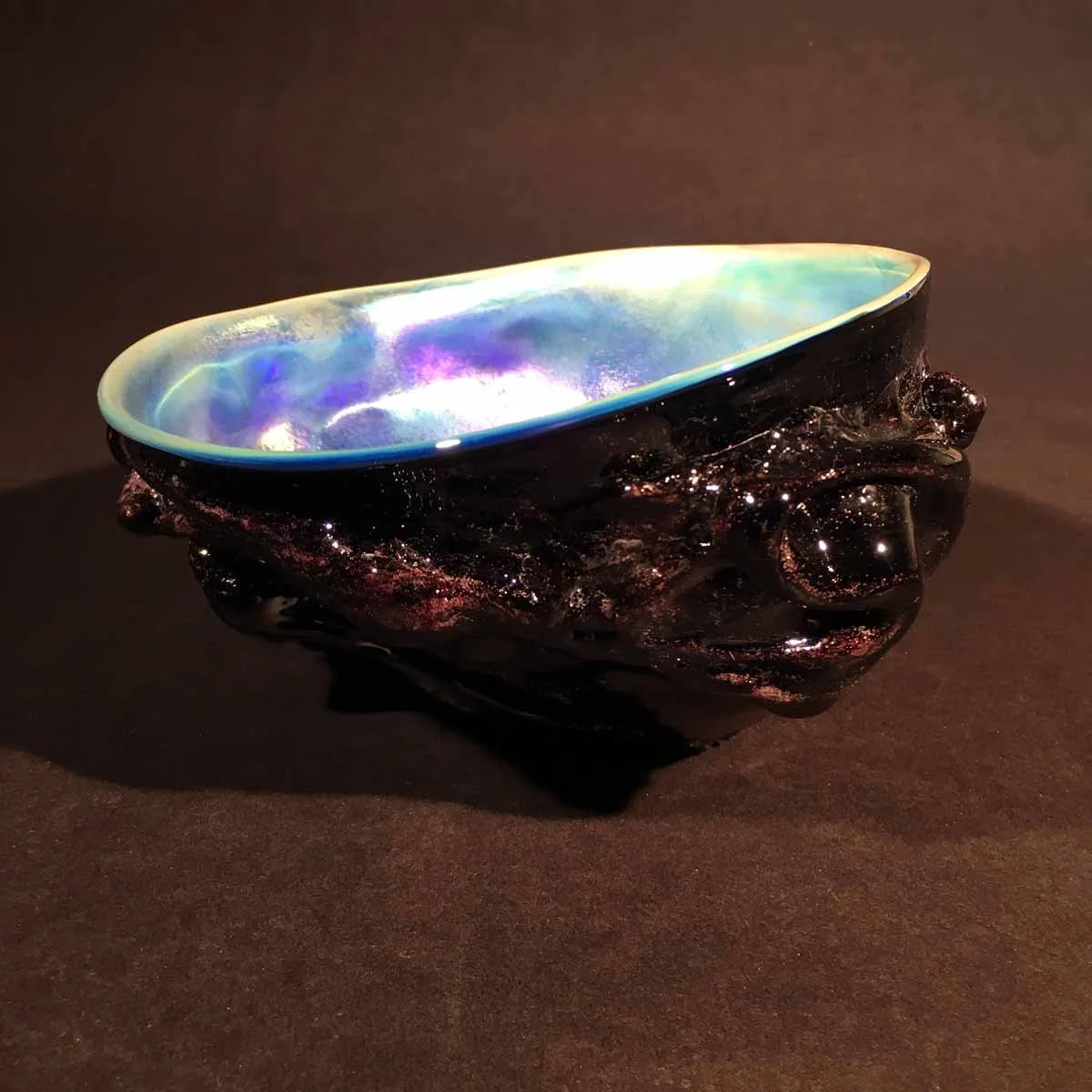 This Iridescent Glass Tektite evokes a meteor that has hurtled through space and burst open upon reaching our atmosphere. Like an intergalactic geode, a gleaming nacreous teal blue interior contrasts dramatically with the gnarly black exterior. This very large Tektite contains Josh’s favorite color of iridescence, a soft teal that wavers in differing light. A simple, elegant form with subtle detailing, it is one of the largest made in current time and very likely the last ever to be made like this (because Josh’s Tektite glass furnace has been re-purposed for other work).