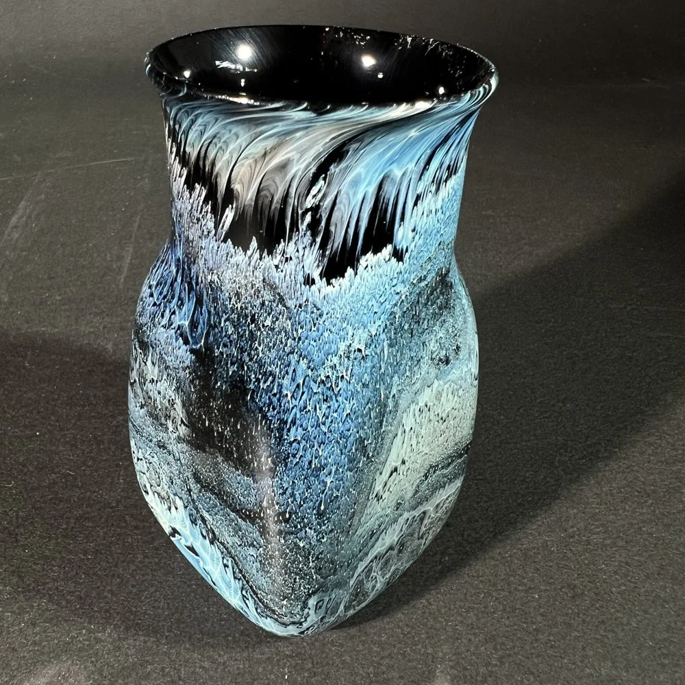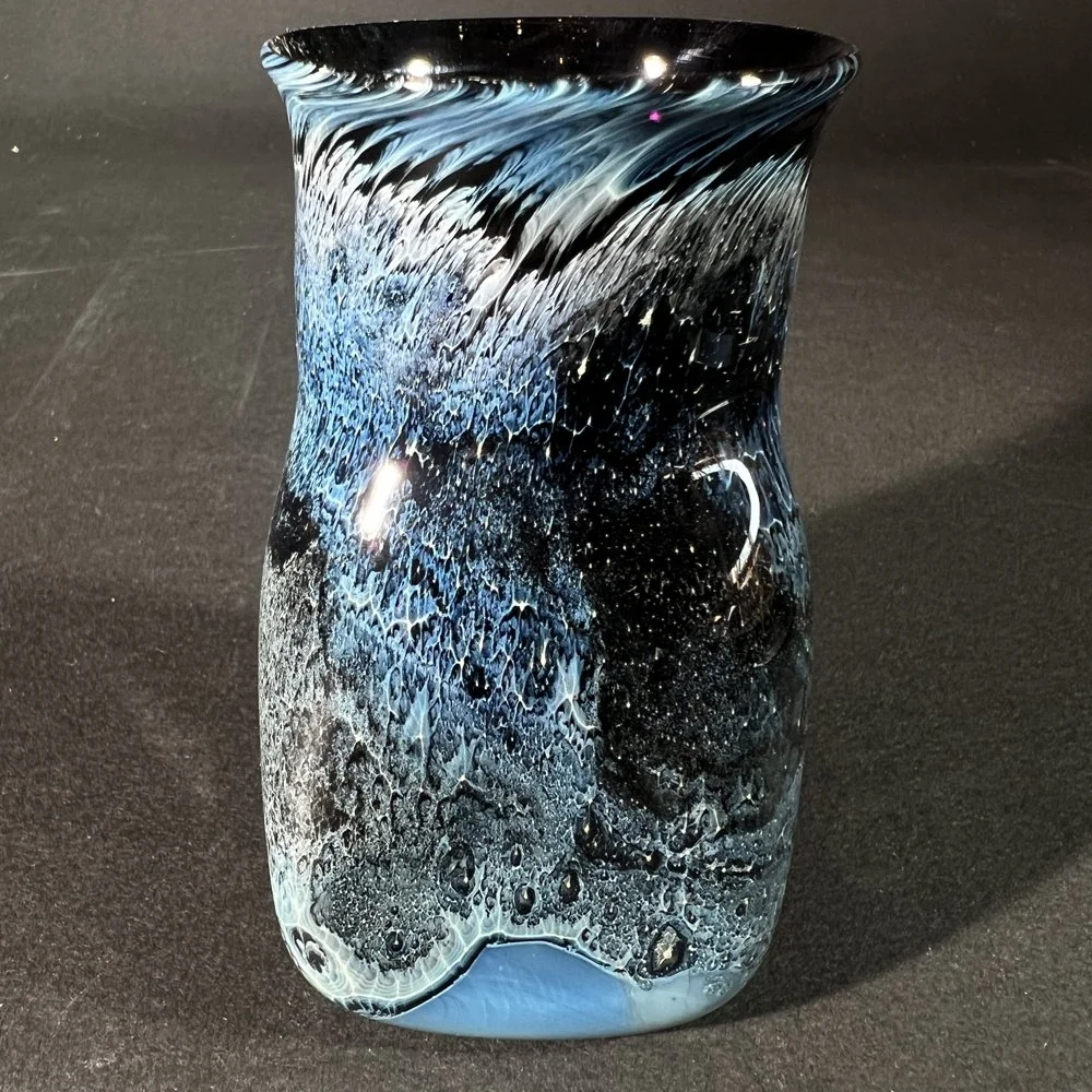 Unique glass tumbler (or quirky vase) is made of dark amethyst glass with applied reactive silver, creating the classic Simpson Blue New Mexico patterning.