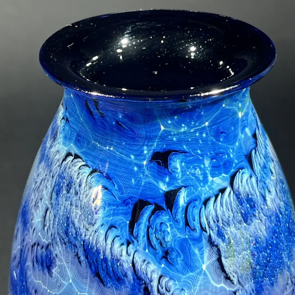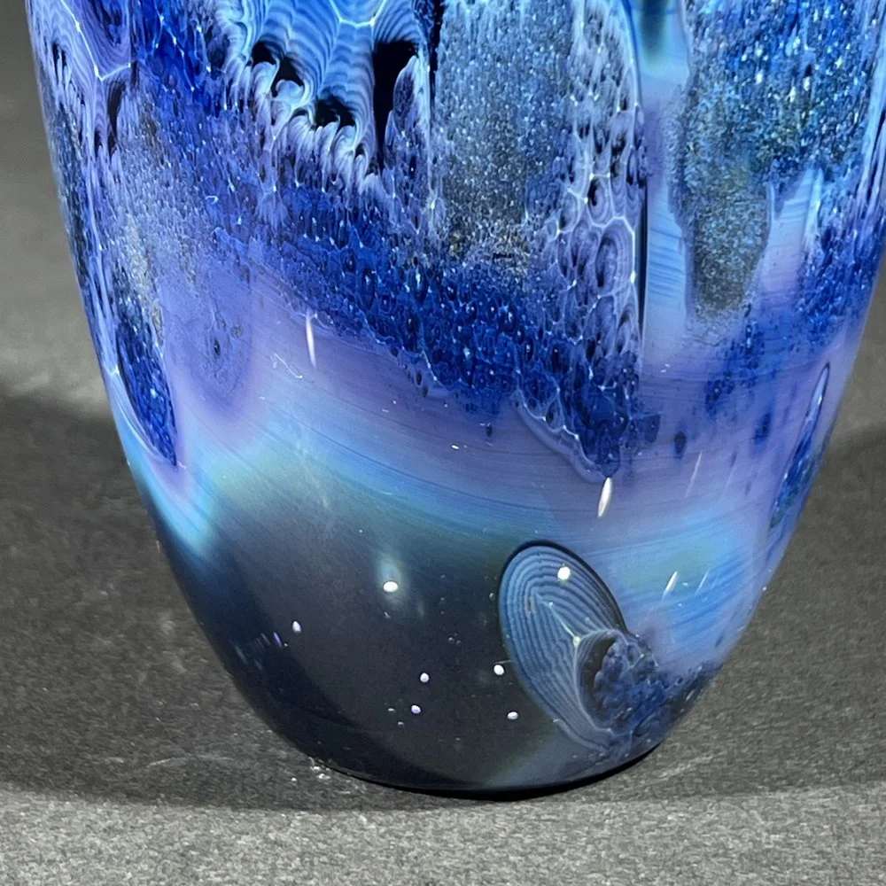 Handblown vase made of blue glass with a reactive silver application that creates Josh's classic New Mexico patterning. Iridized inside for extra shine.