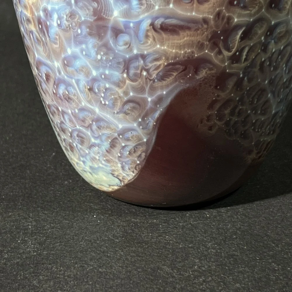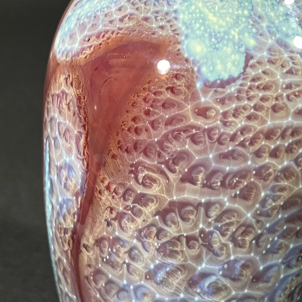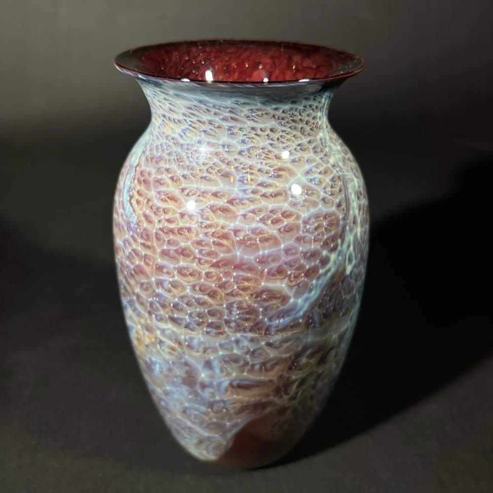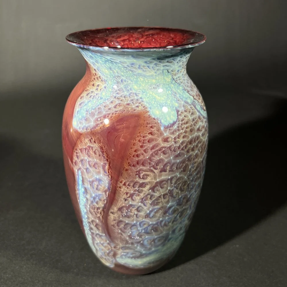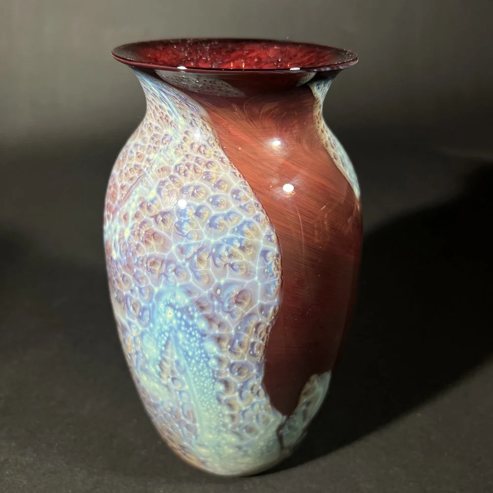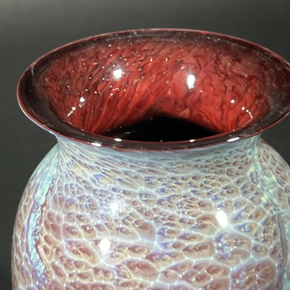 Red New Mexico vase reminiscent of the rich russet, brown, and gold of Martian landscapes. This vase has a tall, tapered shape with a narrow neck and flared lip revealing the Red New Mexico glass interior.