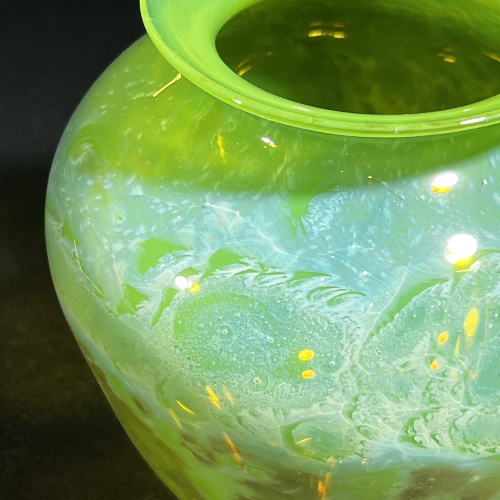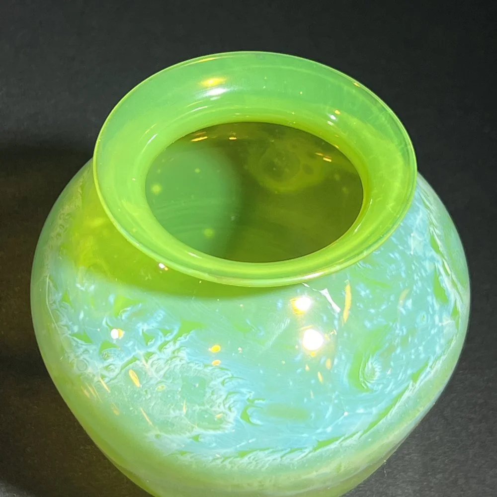 Red New Mexico vase reminiscent of the rich russet, brown, and gold of Martian landscapes. This vase has a tapered shape and wide flared lip revealing the Blue New Mexico glass interior.